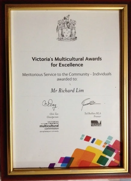 - Medal for serving and contributing to the Springvale Ethnic Chinese Elderly Caring Friendship Association, which was presented by former Federal Senator, Mr. Tsebin Tchen, who is currently a Victorian Multicultural Commissioner.